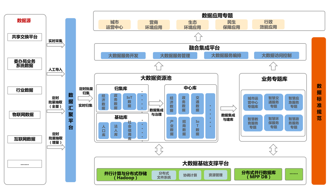 依托統(tǒng)一的數(shù)據(jù)標(biāo)準(zhǔn)規(guī)范,從數(shù)據(jù)采集、數(shù)據(jù)匯聚、集成治理、數(shù)據(jù)存儲(chǔ)到數(shù)據(jù)開放共享和數(shù)據(jù)服務(wù),建設(shè)完整的大數(shù)據(jù)架構(gòu)體系,實(shí)現(xiàn)數(shù)據(jù)全生命周期的管理,支撐大數(shù)據(jù)的業(yè)務(wù)應(yīng)用。